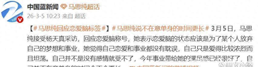 热搜“马思纯回应恋爱脑称号”背后,是一场持续数年的公众形象拉锯战。3月5日,马思纯在接受杨天真采访时首次正面、系统地反击了这一长期附着于她的标签,清晰划出界限:“恋爱脑”是为某人放弃梦想与事业,而自己“恋爱和事业都没耽误”,仅是“爱得比较浓烈且坦荡”。她更坦言,今年事业带来的满足感已足够好,甚至“不在意单身的时间会不会更长”。
